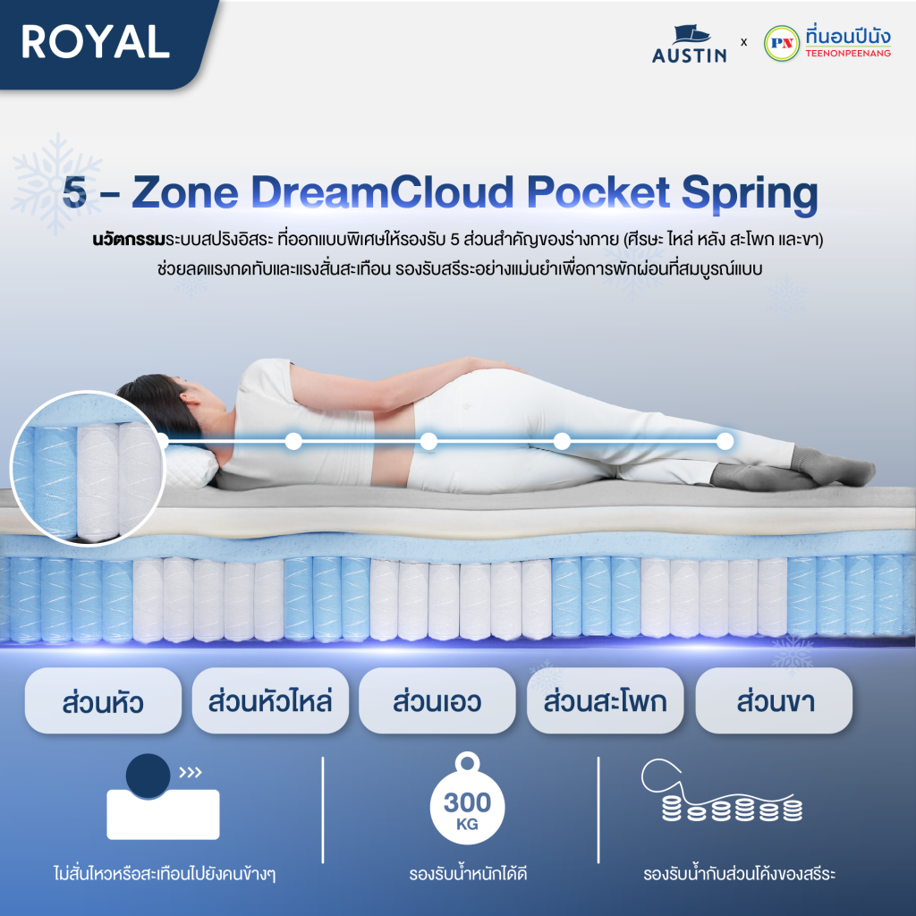 - 5 Zones DreamCloud Pocket Spring: รองรับตามส่วนต่างๆ ของร่างกายอย่างแม่นยำ ลดแรงกดทับและเพิ่มความสบาย