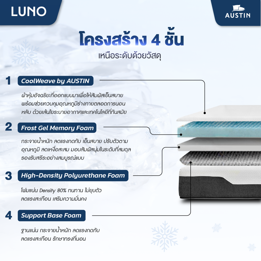 - Frost Gel Memory Foam ชั้นโฟมนวัตกรรมที่ผสานเจลเย็น กระจายน้ำหนัก ลดร้อน ลดอับชื้น